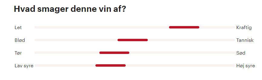 Den har en intens rød farve med aromaer af blomme, kirsebær, sort kirsebær, små røde frugter og en let æterisk fornemmelse, der passer godt til en mere krydret note af vanilje, kanel og kaffe.