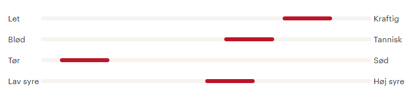 Næsen består af krydderier og røde bær aromaer. Ganen er ret klassisk med en god balance mellem syre og tanniner.