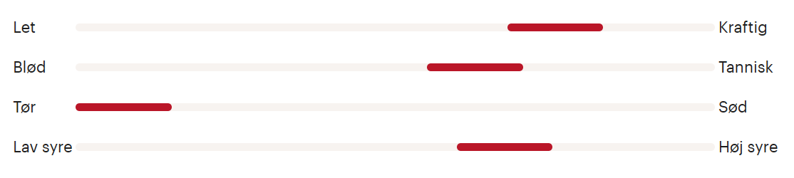 Smagen er frodig, rig og varm. Næsen er intens og frugtig, med aromaer af solbær.